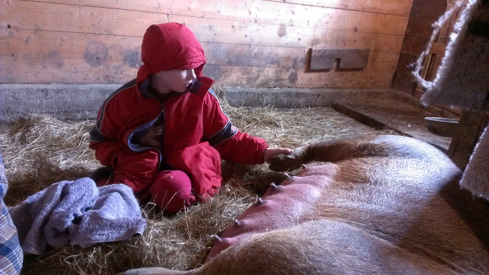 While we were fixing a couple things on the stall, Red stopped pacing and laid down. Oh gosh, we’re getting close.
